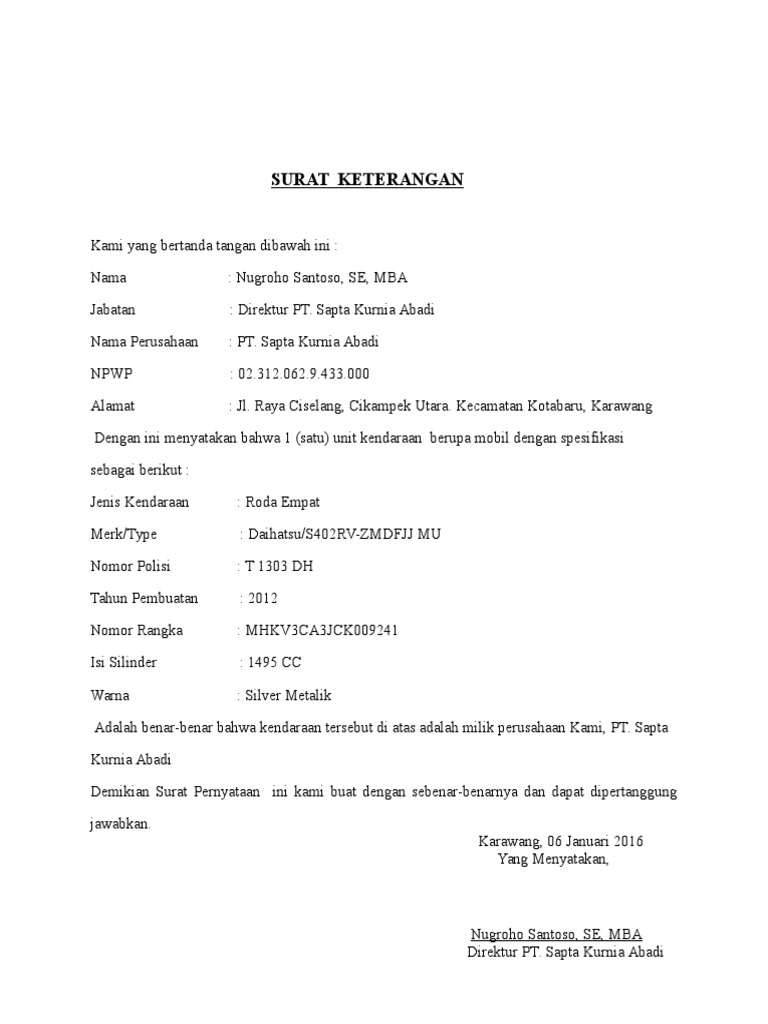 Contoh Surat Kuasa Untuk Mengurus Samsat Atau Pajak Mobil Dan Motor Blog Bikincv from www.bikincv.com Dengan surat kuasa ini, saya selaku pemberi kuasa memberika kuasa kepada isti saya yang bernama hidayati (penerima kuasa) untuk melakukan pengambilan uang secara tunai dengan nominal rp. Fotocopy surat akta penyerahan dan bukti bayar 4. Surat kuasa harap segera dikirim maksimal 30 hari setelah submit lhkpn. Hal itu dikarenakan kendaraan yang akan disewakan nilai atau nominalnya juga cukup besar sehingga dibutuhkan surat perjanjian sebagai jaminan. (2) kepemilikan kendaraan bermotor didasarkan atas nama dan/atau alamat yang sama. Jun 10, 2021 · "sebagian besar investasi bpkh ada di instrumen surat berharga syariah yang dilaksanakan dan dijamin oleh pemerintah ri sesuai dengan uu nomor 19 tahun 2008 tentang surat berharga syariah negara. Fotocopy ktp pemilik kendaraan 2. Yang tidak memiliki dokumen kepemilikan dengan nilai perolehan di atas rp100.000.000,00 (seratus juta rupiah) per unit/satuan, yakni fotokopi berita acara serah terima (bast) perolehan barang dan dokumen lainnya.